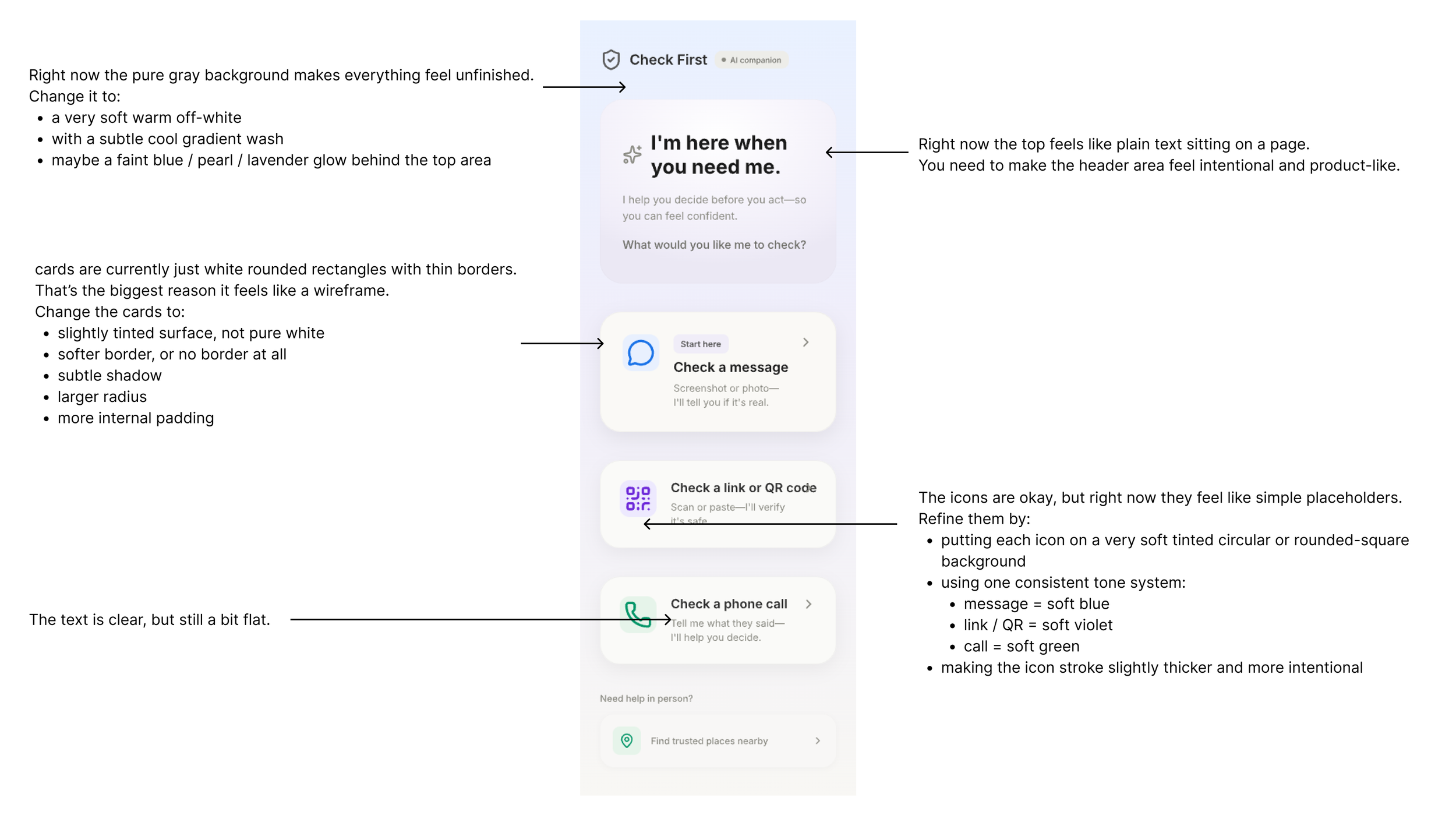 I also used AI to quickly iterate on visual direction, testing how changes in hierarchy, tone, surface treatment, and iconography could transform a screen from a rough wireframe into a more polished and product-like interface.
