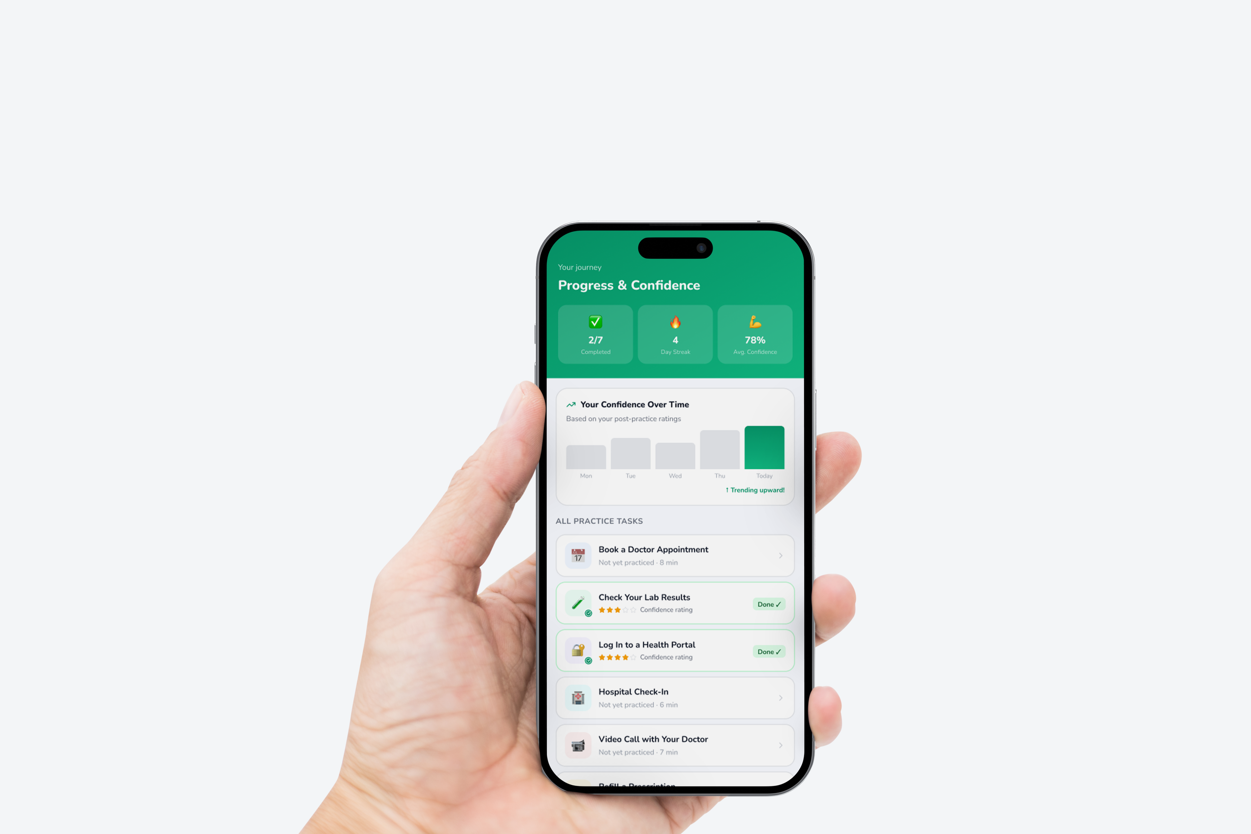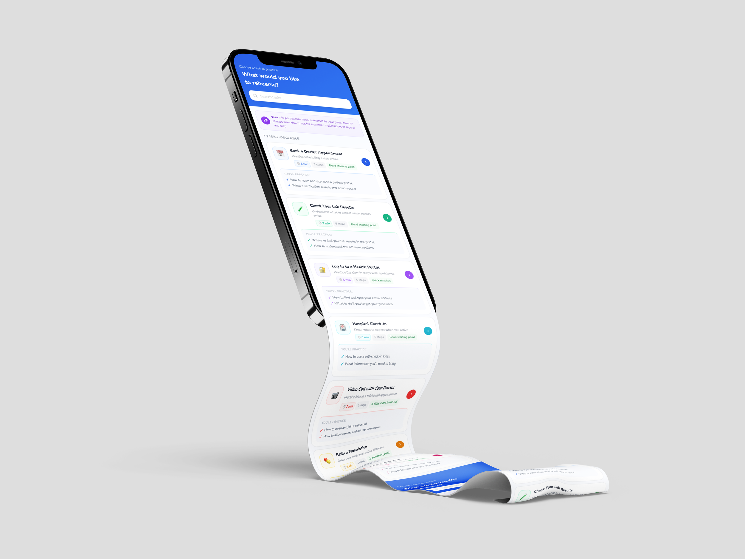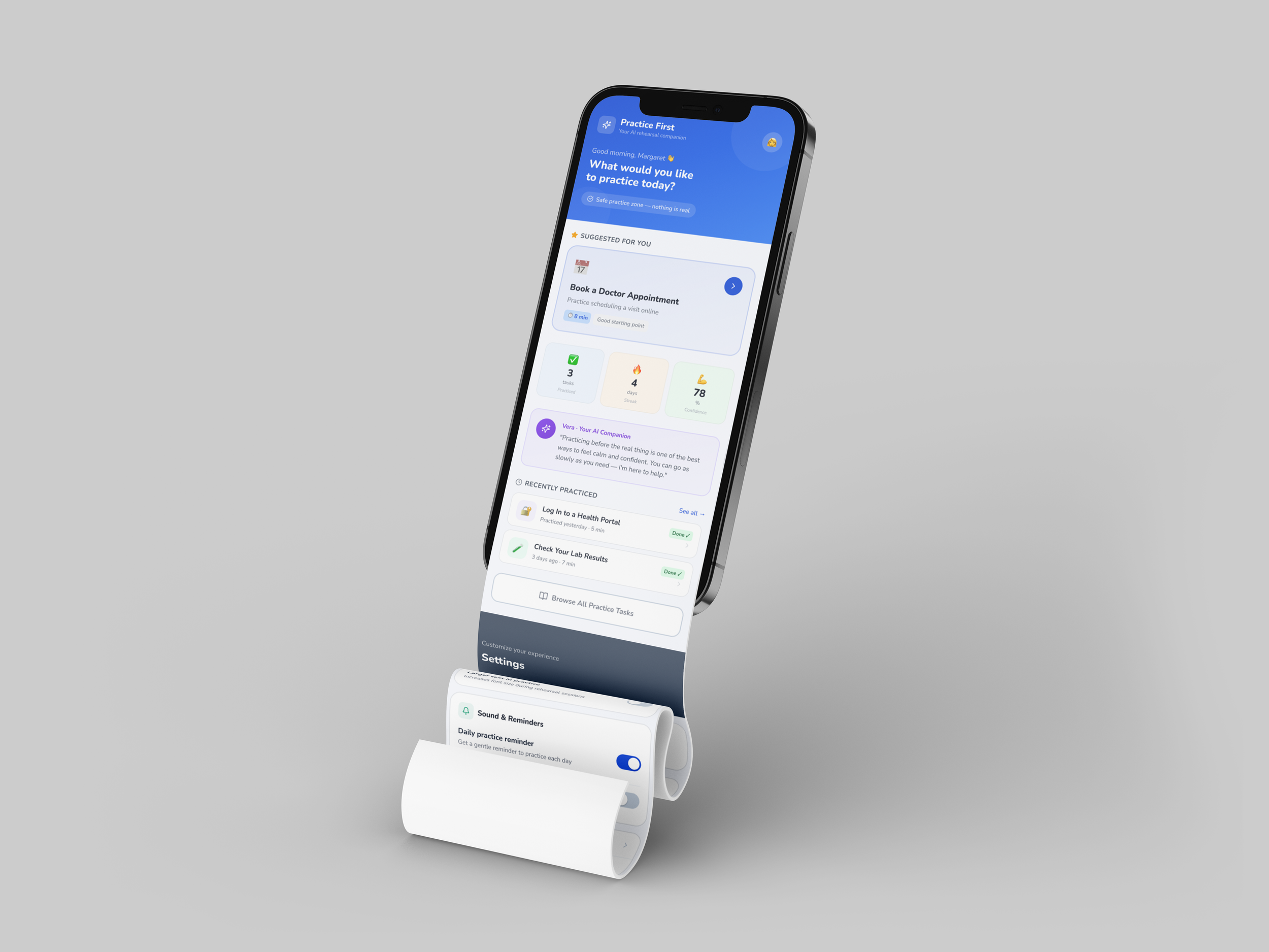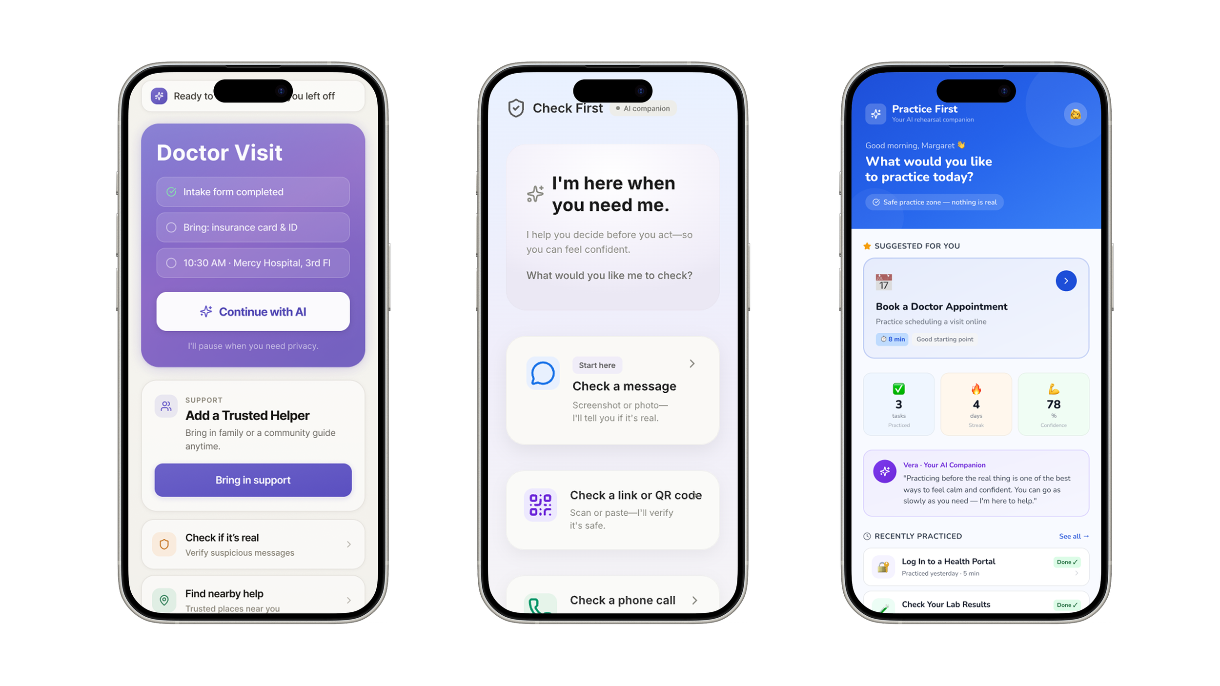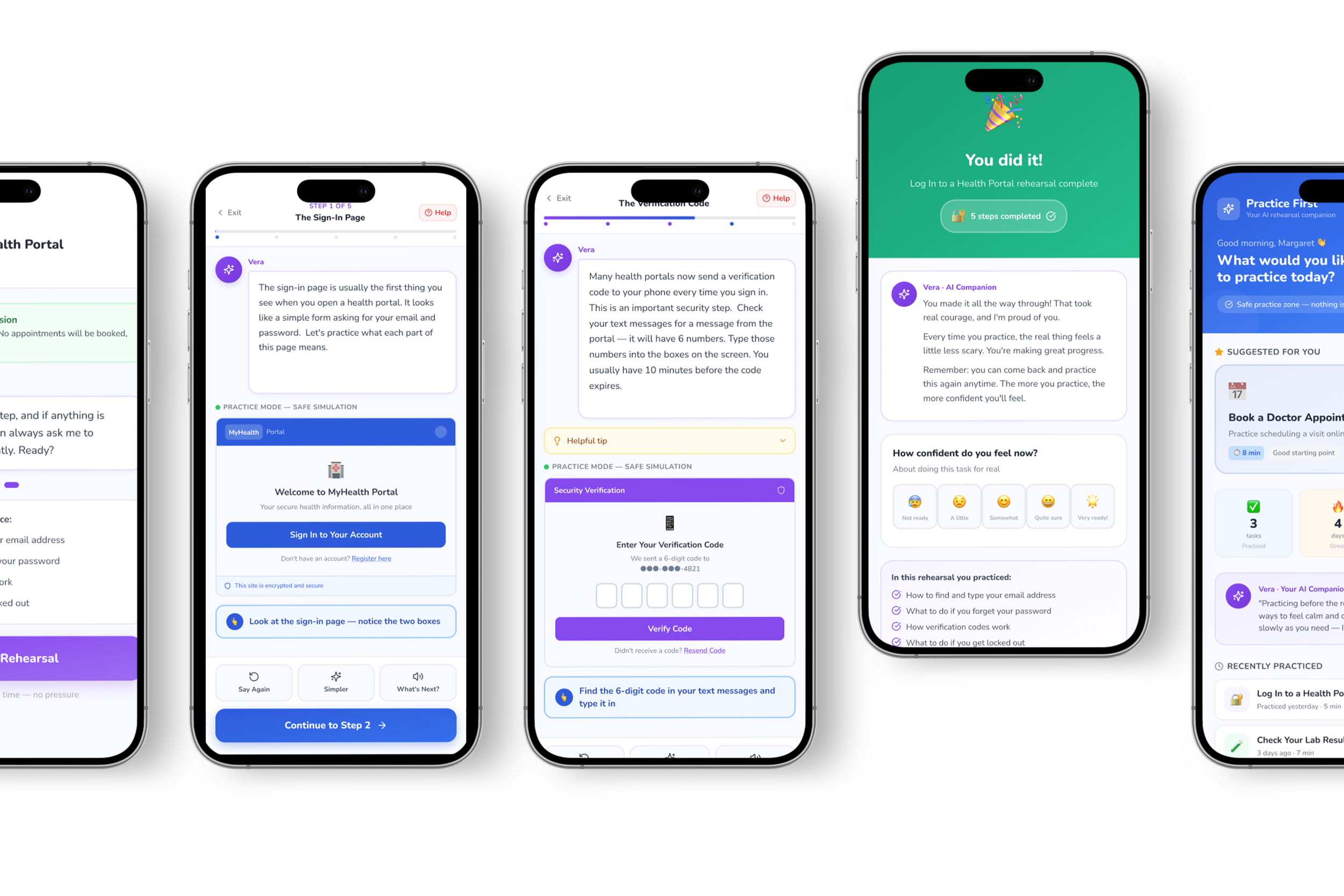 The final design centers on an AI companion built into the app, guiding older adults through unfamiliar digital tasks with clear, step-by-step support, reassurance, and practice-based learning. Beyond the AI bot, the platform includes features designed to reduce stress and build confidence, such as task rehearsal, progress tracking, simple explanations, private moments for sensitive information, and access to trusted support when needed. Together, these functions create a more supportive, accessible, and confidence-building experience for elders navigating healthcare and other important digital systems.