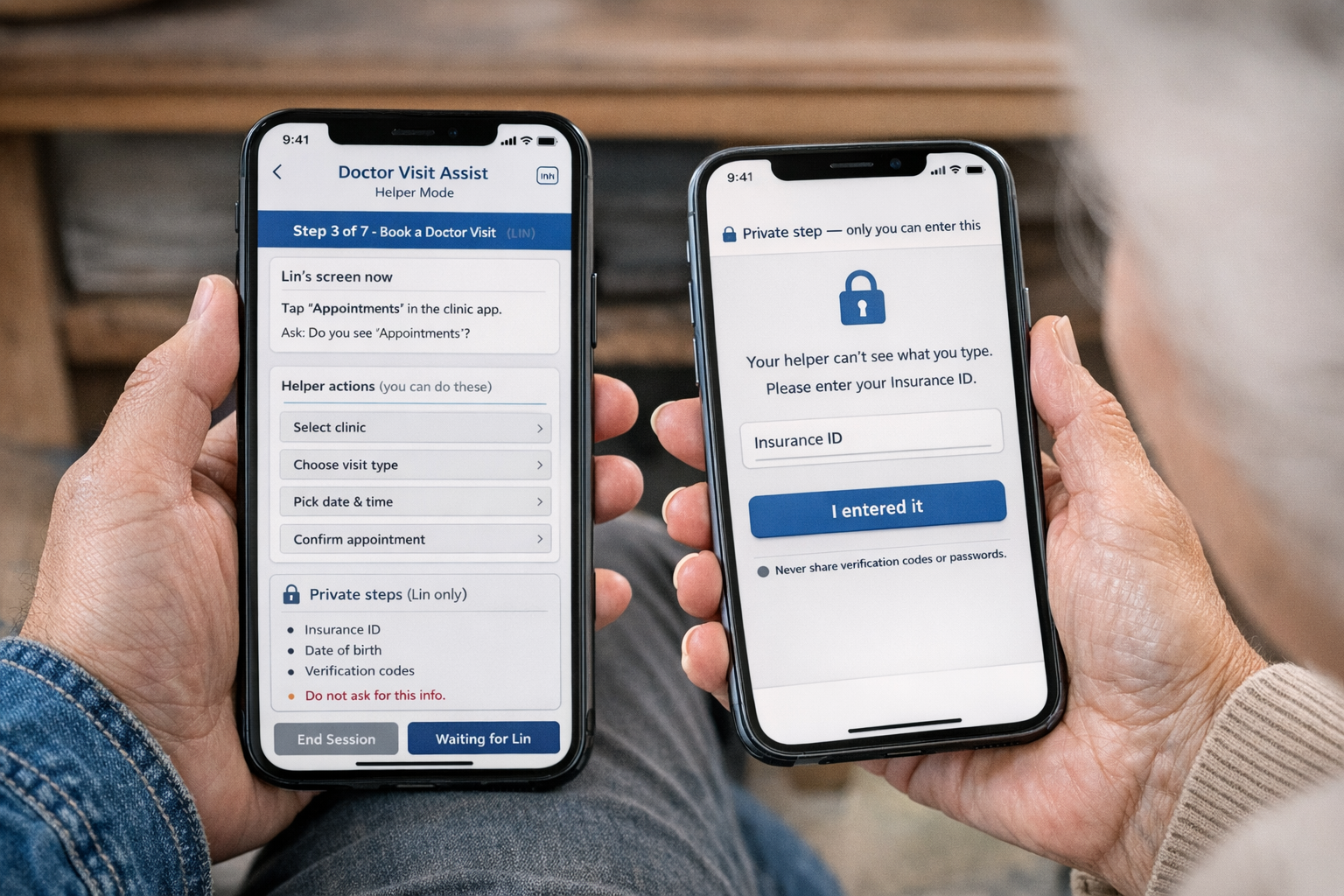 In the early stages of this project, I explored different ways technology could support older adults through stressful and private tasks. My first concepts focused on functional, guided interfaces, including e-reader-like screens and dual-device flows that allowed a helper to assist without seeing sensitive information. These explorations shaped the project’s core ideas around clarity, accessibility, privacy, and step-by-step support.