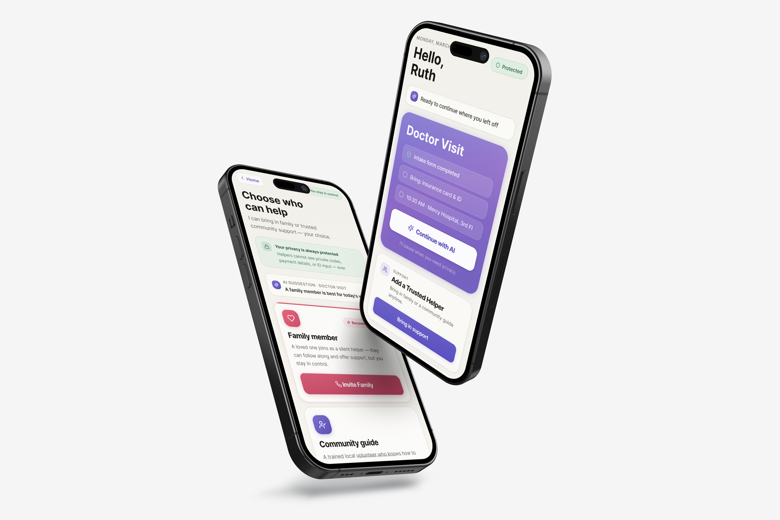 This project is a privacy-first support platform designed for people navigating vulnerable or invisible life experiences. It combines calm, accessible mobile interactions with guided AI support, helping users navigate sensitive moments at their own pace while protecting their dignity, autonomy, and emotional safety. The design focuses on trust, clarity, and human-centered care, creating a digital experience that feels supportive without being intrusive.